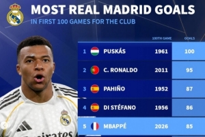 体育资讯4月25日讯 皇马在本轮西甲1-1遭贝蒂斯绝平,姆巴佩首发出战,解锁个人皇马生涯100场里程碑。《转会市场》也统计了皇马球员百场进球榜。