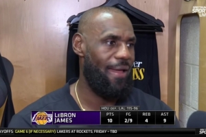 体育资讯4月27日讯 NBA季后赛首轮G4,湖人96-113不敌火箭,系列赛大比分来到3-1。赛后詹姆斯接受了采访,以下为完整采访内容。