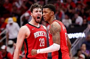 体育资讯4月27日讯 火箭今日主场以115-96击败湖人,将系列赛比分扳至1-3。赛后,火箭球员小贾巴里接受媒体采访。