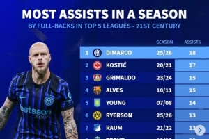 本世纪边后卫单赛季助攻榜:迪马尔科居首,阿诺德阿尔维斯两上榜