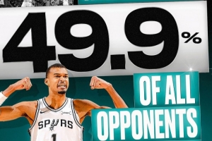 体育资讯4月20日讯 NBA官方发文谈到文班的封盖表现,其中一项数据写到和文班交手的球员有近半数都被他封盖过。