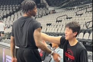 体育资讯4月23日讯 昨日开拓者对阵马刺G2赛前,记者周玲安拍到杨瀚森和队友乐福积极互动,并与助教伯勒尔用英文流利沟通。伯勒尔是去年夏联时球队的主帅。