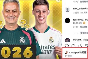 外媒score90在ins晒出穆里尼奥执教皇马时的胜率和数据,并表示他目前是皇马新帅热门人选之一,姆巴佩点赞了这条社媒。